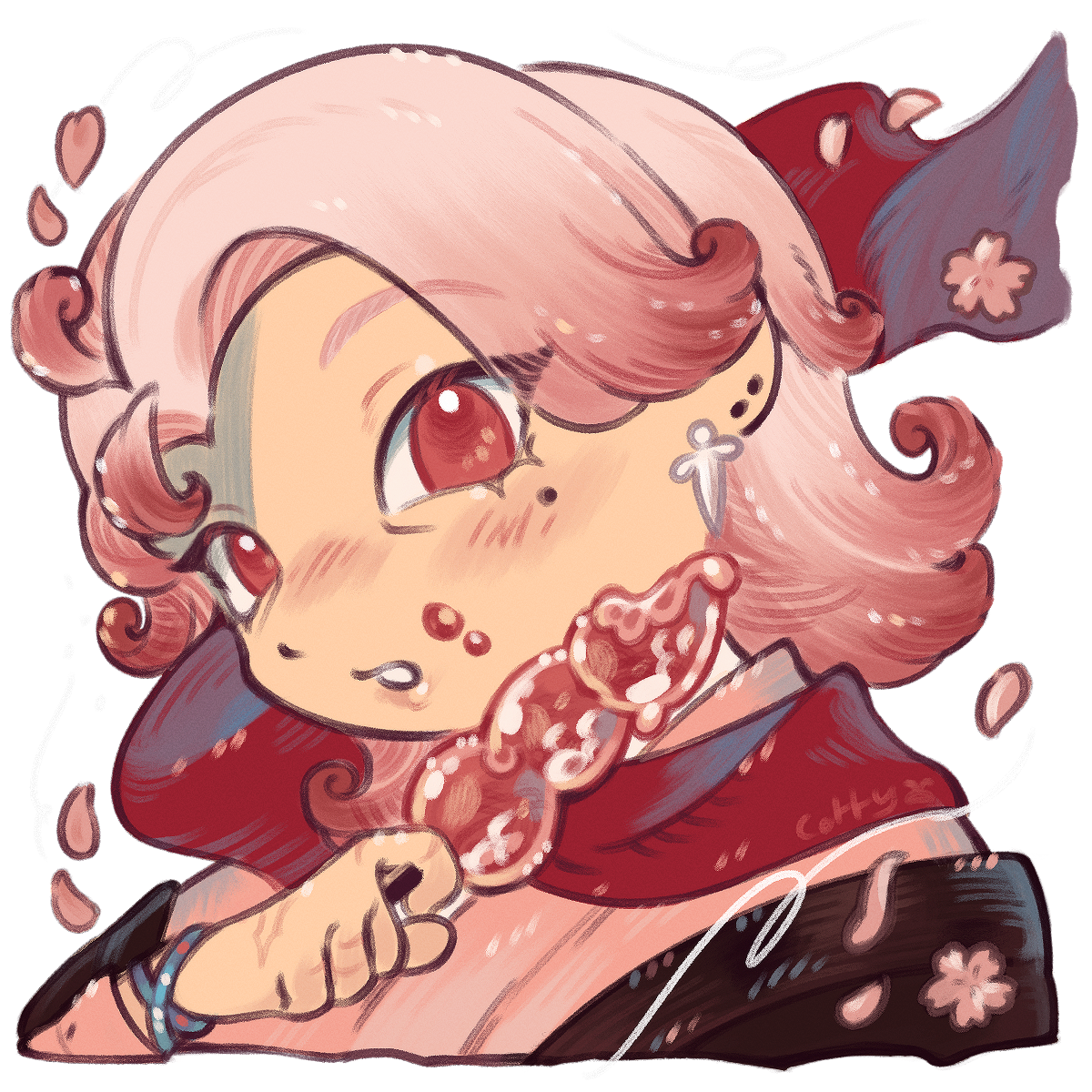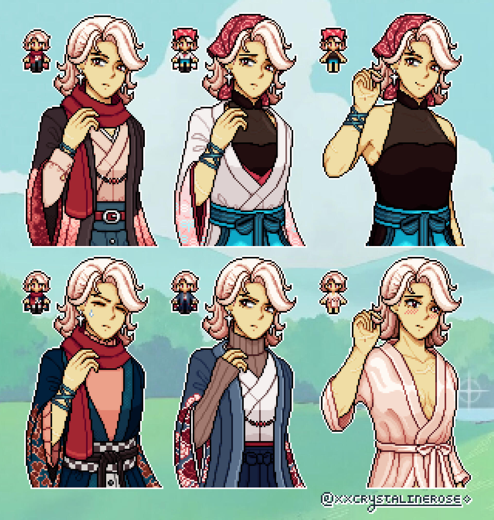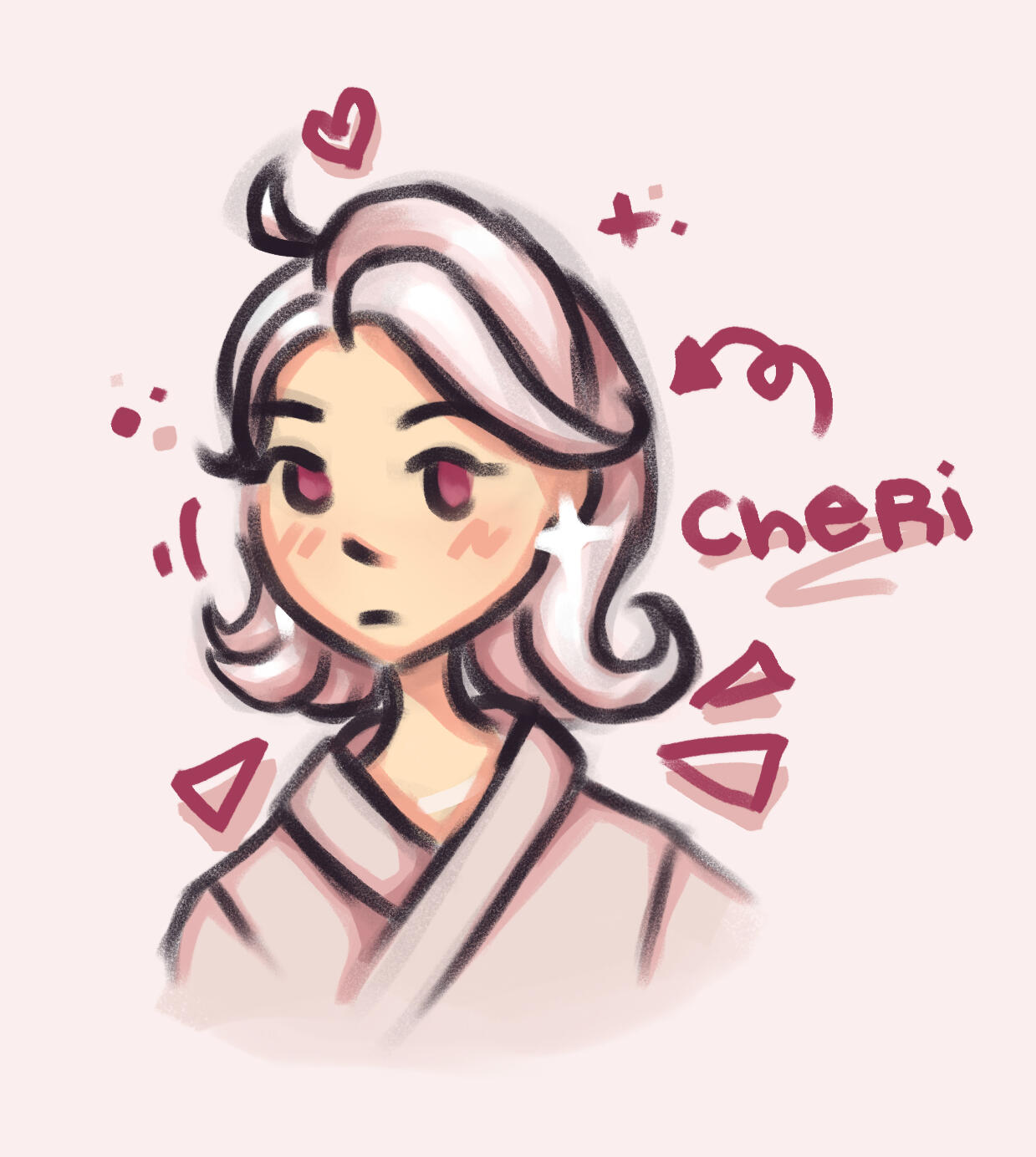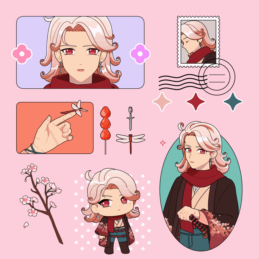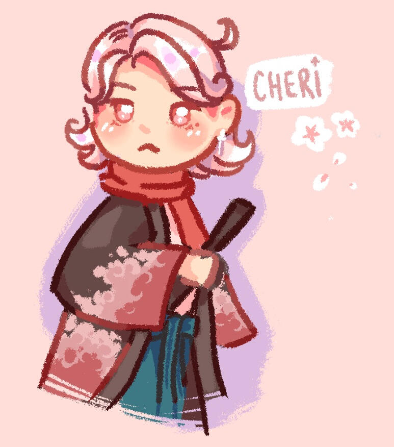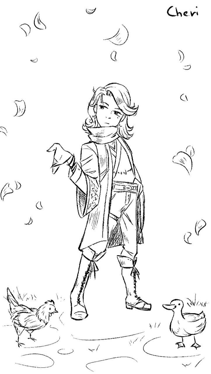'Cheri' is a Fields of Mistria↗ original character by Kisaa (crystalinerose). They are the most recent addition to Mistria's community, having arrived a season prior to the player, and a secret marriage candidate.An errand runner who operates the special Commissions Board by Balor's Wagon, Cheri spends their day delivering items or completing tasks on behalf of the townsfolk for a fee. While they are often found patrolling Mistria, Cheri also works part-time at the Sleeping Dragon Inn as Reina's occasional sous chef and manning the counter in the Carpenter's Shop to stand in for Ryis or Landen.An old friend of Balor's, Cheri moved into Mistria at his behest, whereupon he gives a commendation to Adeline to guarantee their stay and work in the town. Despite their current peaceful undertakings, the sword that never leaves their person imply a turbulent past.
